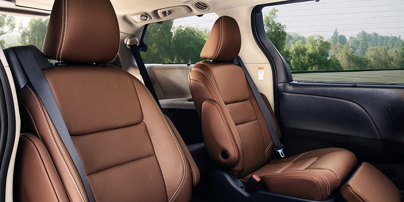 The Sienna, like most minivans, has three rows of seats and room for up to seven or eight passengers depending on the configuration. There are two sets of LATCH seat connections for car seats in the second row and two sets in the third row. The lower-end models have cloth upholstery with leather starting in the SE. The XLE adds a power-adjustable passengers seat, and the Limited adds premium leather upholstery, driver-seat memory functions, and it has a heated steering wheel.