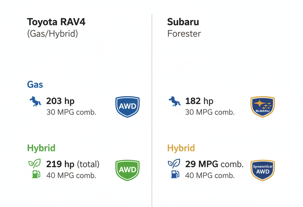 RAV4 gas models pair the engine with a smooth automatic that keeps the drive relaxed. Hybrid models use an efficient electronically controlled system that focuses on seamless power delivery. Forester uses a continuously variable transmission tuned for everyday response. Both SUVs offer drive modes that tailor throttle and traction for conditions you will see across the Triangle.