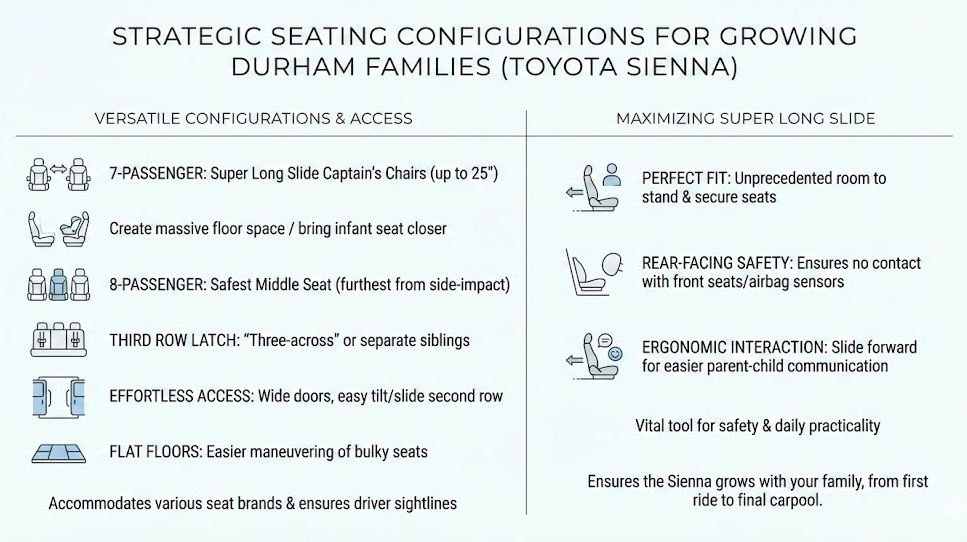 The Super Long Slide feature in the Toyota Sienna is more than just a convenience; it is a vital tool for achieving a perfect car seat fit. By sliding the second-row seats back, parents gain an unprecedented amount of room to stand inside the vehicle while securing a car seat, which is crucial for applying the necessary leverage to tighten LATCH straps. This extra space also ensures that rear-facing seats do not touch the front vehicle seats, which is a common installation error that can interfere with airbag sensors. Conversely, sliding the seat forward allows for easier communication and interaction with a young child from the front passenger seat. This adaptability makes the Sienna the most ergonomic choice for parents who value both safety and daily practicality.