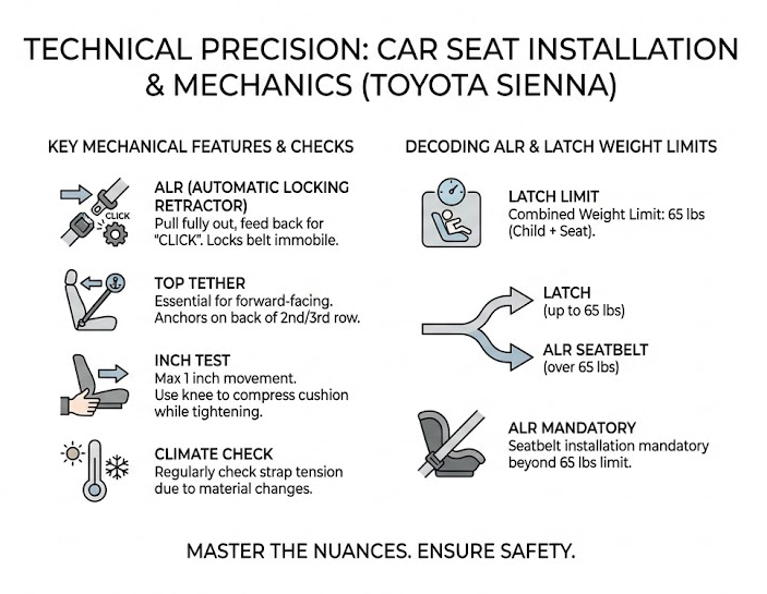 The interplay between ALR seatbelts and LATCH anchors is a cornerstone of vehicle safety education. The LATCH system was designed to simplify installation, but its weight capacity is physically limited by the strength of the anchors and the vehicle’s frame at those points. Toyota specifies a combined weight limit of 65 pounds for the LATCH system in the Sienna. Parents must calculate this carefully: if a heavy “all-in-one” seat weighs 25 pounds, the LATCH system can only be used until the child weighs 40 pounds. Beyond this, the ALR seatbelt installation is the only approved method. Understanding this transition is vital for maintaining the structural integrity of the restraint system during a high-speed impact on North Carolina highways.