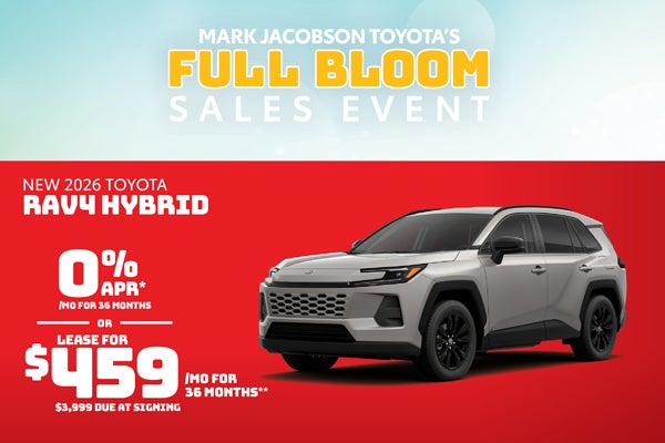 *(Model #4521) See Mark Jacobson Toyota for more details on these offers. 0% APR for 36 monthly payments of $27.78 for every $1,000 financed. No security deposit required. Adding options increases payment. Only a limited number of customers will qualify for advertised APR. Require credit approval. Not all will qualify. Cannot be combined with other offers. With approved credit through a dealer approved lender. Max finance is $30k.**12,000 miles per year. Not valid on prior purchases. $0.25 per mile over. $3,999 due at signing. No security deposit required. Adding options increases payment. Require credit approval. Not all will qualify. Must lease with SETF. May not be combined with certain other offers. Offers exclude tax, tag, registration, title, and $798 dealer fees. Expires 05/04/2026