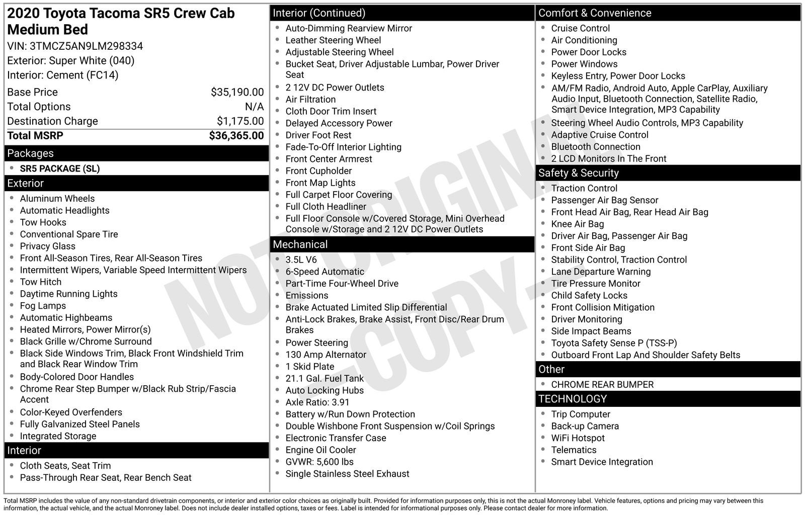 As a one-owner vehicle that was serviced here at our dealership, you can trust that this Tacoma has been well-maintained and cared for. With its impressive features, robust performance, and exceptional value, this 2020 Toyota Tacoma SR5 V6 is the perfect choice for those seeking a reliable and capable truck.