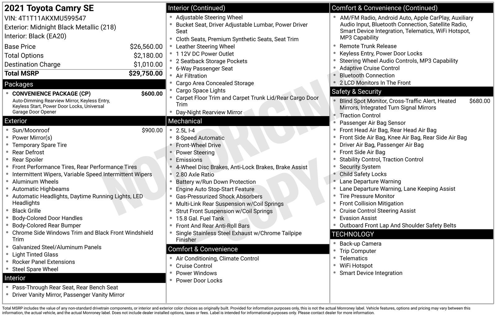 The Camry SE's impressive list of standard features includes a comprehensive suite of advanced safety technologies, such as Blind Spot Monitor with Rear Cross-Traffic Alert, to help keep you and your passengers secure. The Convenience Package adds even more convenience and luxury, with features like HomeLink, an auto-dimming rearview mirror, and a smart key system with push-button start.