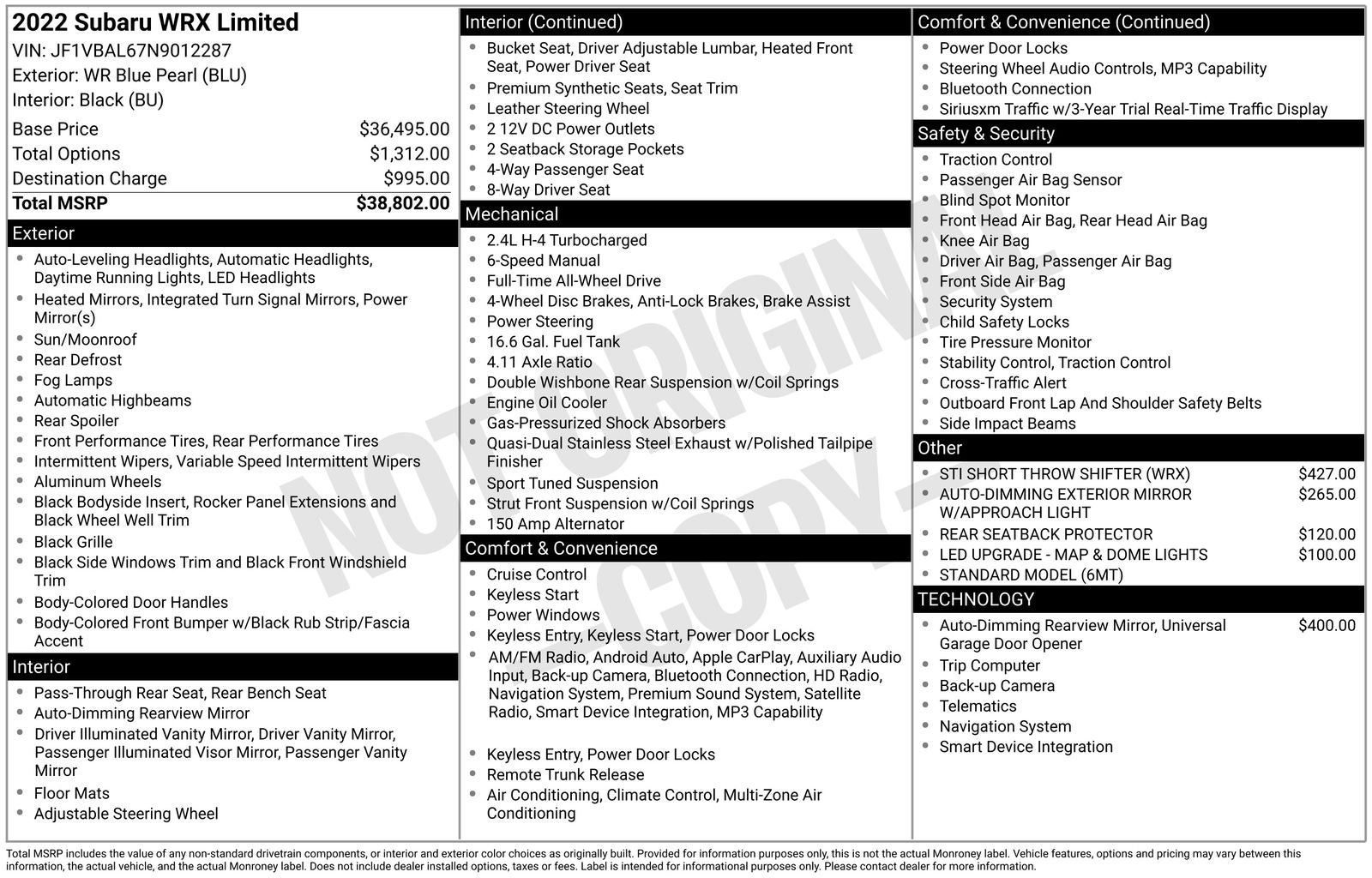 Whether you're carving through winding roads or navigating the daily commute, this 2022 Subaru WRX Limited is the perfect companion. With an EPA-estimated 19 MPG city and 26 MPG highway, you can savor every mile without sacrificing efficiency.