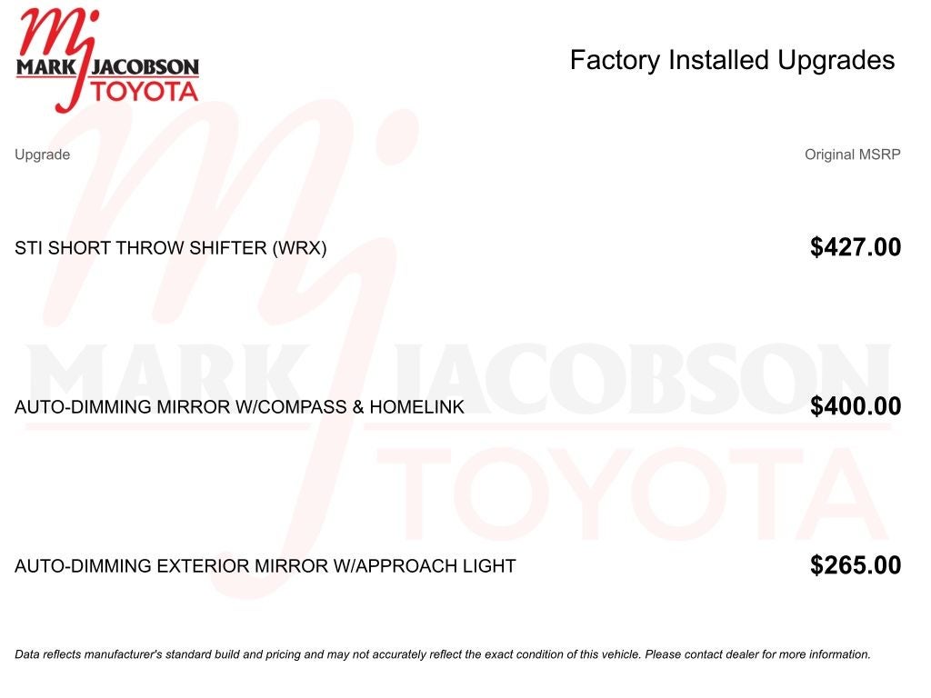 Elevate your daily drives with premium features that elevate both comfort and convenience. Enjoy the convenience of Bluetooth® connectivity, the expansive view of the power moonroof, and the confidence of a backup camera. The performance-focused cabin sets the stage for an engaging driving experience, with supportive sport seats, a leather-wrapped steering wheel, and the precision of the STI short-throw shifter.