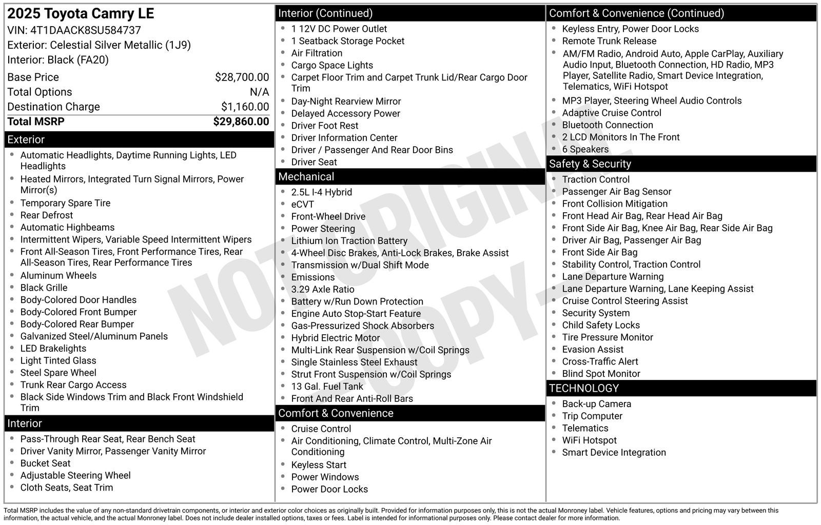Whether you're commuting to the office or embarking on a weekend getaway, the 2025 Toyota Camry LE offers a compelling blend of style, efficiency, and advanced features. Experience the difference for yourself and schedule a test drive today. We're confident you'll be impressed by the exceptional value and versatility this Camry has to offer.