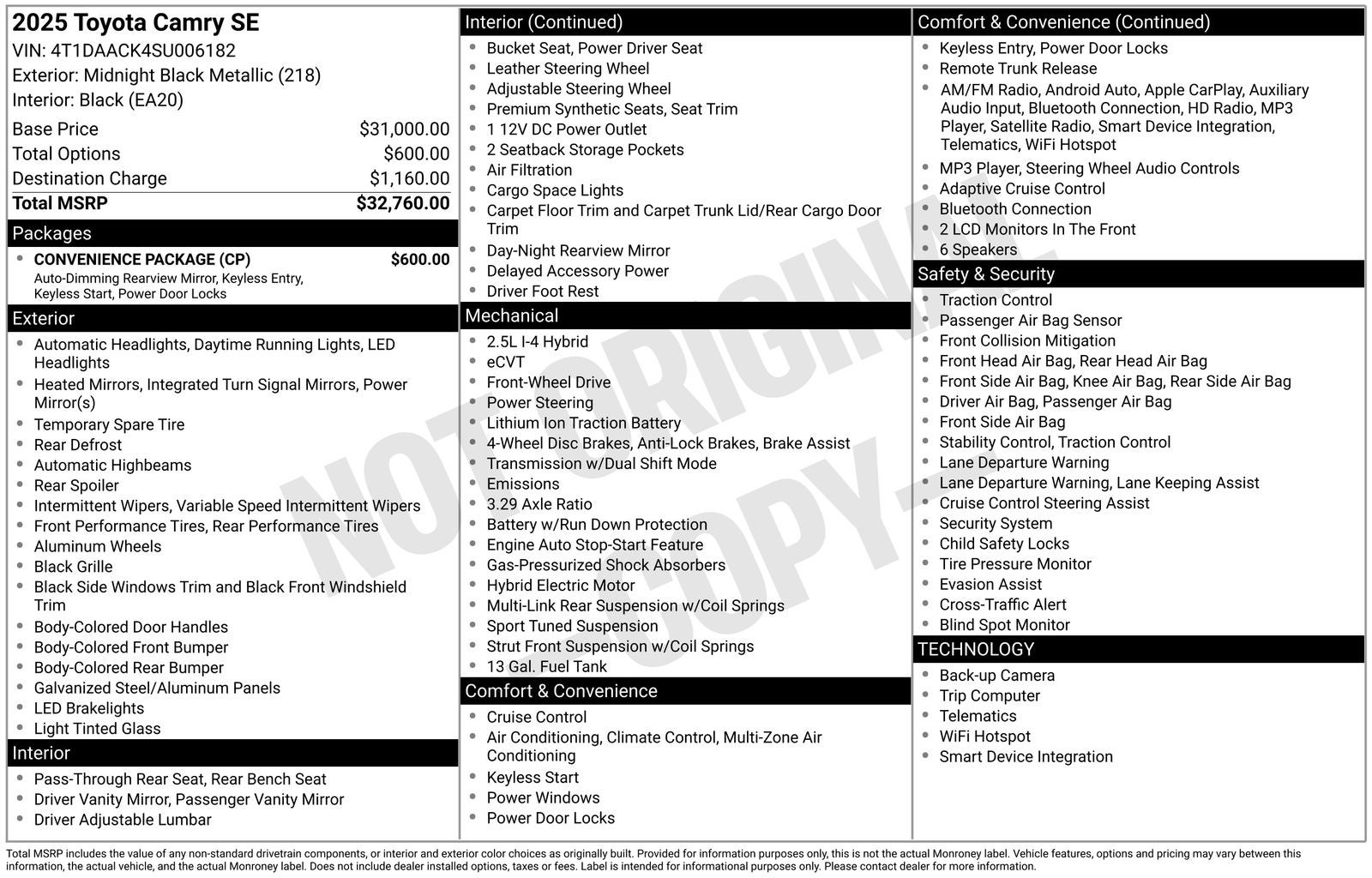 Boasting a sleek, sophisticated exterior in a striking Black color, the 2025 Camry SE commands attention wherever it goes. Under the hood, the efficient 2.5L 4-Cylinder 16V DOHC engine, paired with the eCVT transmission and FWD system, delivers an impressive 48 city / 47 highway MPG, making it an exceptional choice for the eco-conscious driver.