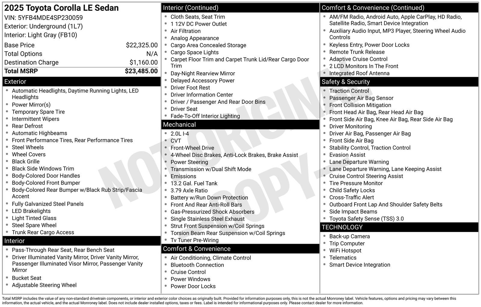 Designed with your safety in mind, this Corolla LE is equipped with a comprehensive suite of advanced safety technologies, including Electronic Stability Control, Brake Assist, and a suite of airbags to help protect you and your passengers. The Exterior Parking Camera Rear and Auto High-Beam Headlights further enhance your visibility and driving confidence.