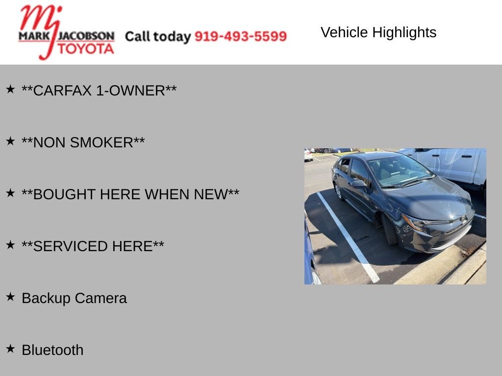Boasting a remarkable - 32 city / 41 highway MPG, this Corolla LE delivers exceptional fuel economy, allowing you to go farther on every tank and save on those daily commutes or weekend getaways. The vehicle's CARFAX 1-Owner history and non-smoking status further attest to its exceptional condition and well-maintained pedigree.