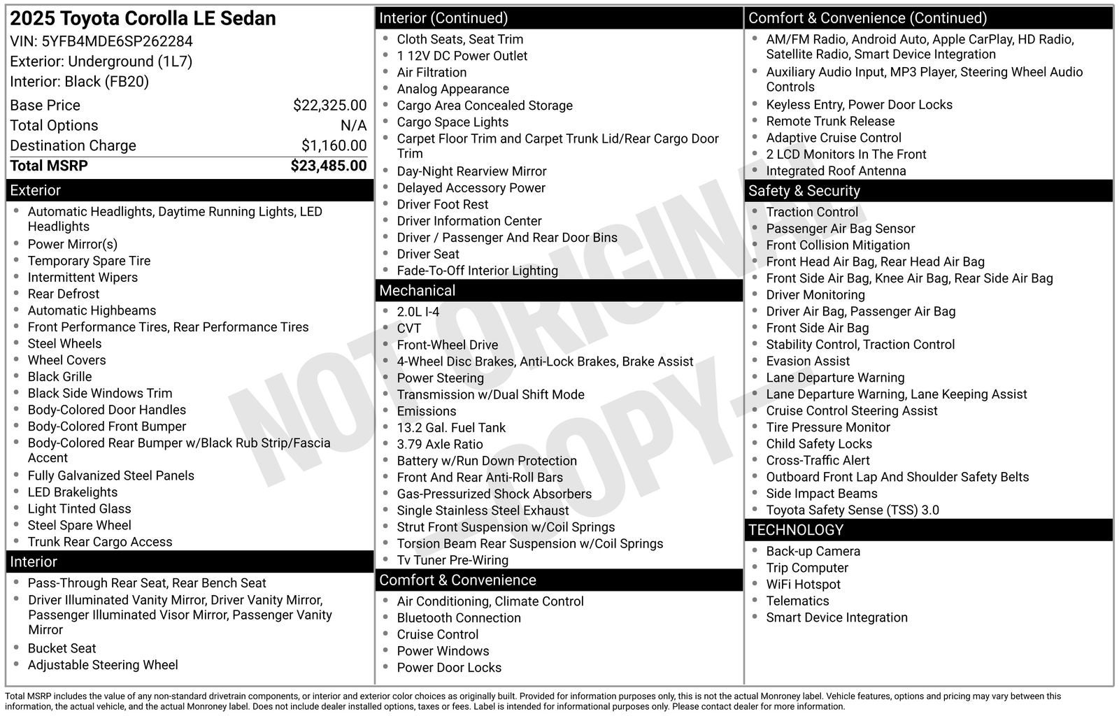 Designed to exceed your expectations, the 2025 Toyota Corolla LE is a true testament to Toyota's commitment to quality and innovation. Experience the difference for yourself and schedule a test drive today. We're confident that this exceptional vehicle will exceed your every expectation.