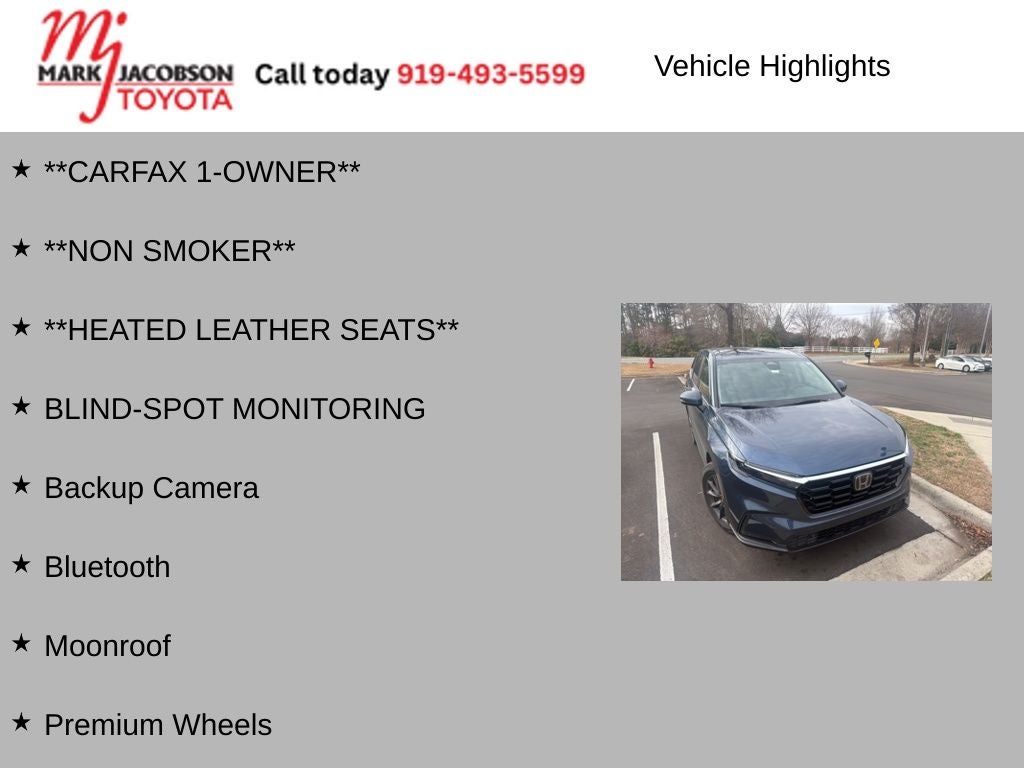 Indulge in the comfort and convenience of the CR-V's premium amenities, including - Blind-Spot Monitoring, Backup Camera, Bluetooth®, Moonroof, and Premium Wheels. The heated leather seats provide a luxurious touch, ensuring your rides are both relaxing and refined.