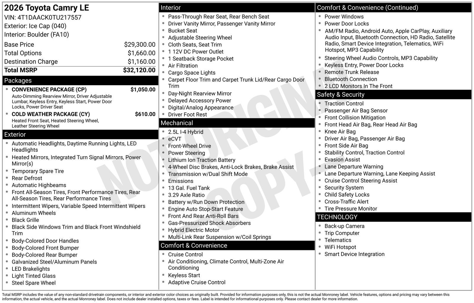 The Camry LE's impressive safety suite, including features like Blind-Spot Monitoring and a Backup Camera, provides you with peace of mind behind the wheel. Additionally, the Convenience Package and Cold Weather Package add even more convenience and comfort, with features like a power-adjustable driver's seat, heated front seats, and a heated steering wheel.